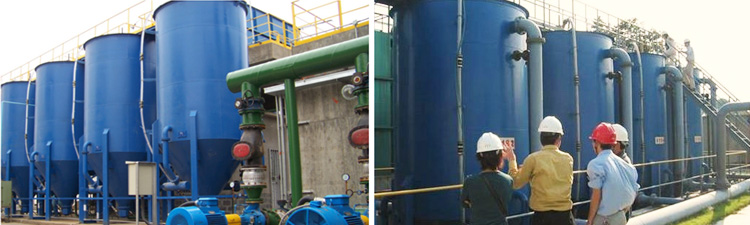 中水回用工程系统采用8台P-55流砂过滤器,一台PAM加药装置,一台PAC加药装置和3台空压机组成,来水分别经PAC、PAM混凝处理后进流砂过滤器过滤,处理后的出水,经臭氧处理后进入下道流程。