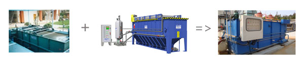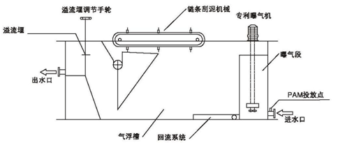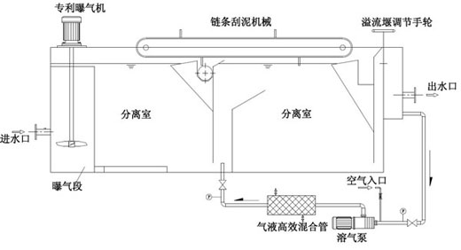 原理:前段采用涡凹原理,利用曝气机抽吸空气并粉碎成微气泡,顶托裹携絮体上浮;后段采用多相流泵原理,将空气和回流水经泵进口一起吸入,再经泵的叶轮交切形成细小的溶气水,再过减压阀释放成乳白色的溶气水,使絮凝颗粒上浮。