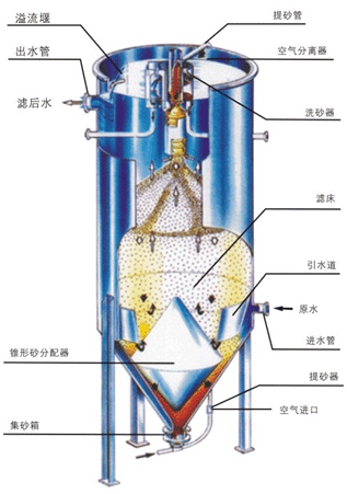 当过滤不断进行时,原水中的杂质也不断地被累积和截留在滤料表面,而截污量最大的是底部的滤料。设在过滤器底部的压缩空气提砂装置首先将此部分滤料通过特 殊材质的洗砂管分批定量提送至顶部的三相(水、气和砂)分离器中,空气排放,水和砂再进入相连的洗砂器中清洗,洗砂水由单独的管道排放,洗干净的砂又重新 散落分布到整个滤床表面,实现了滤料的清洗和循环流动的过程。